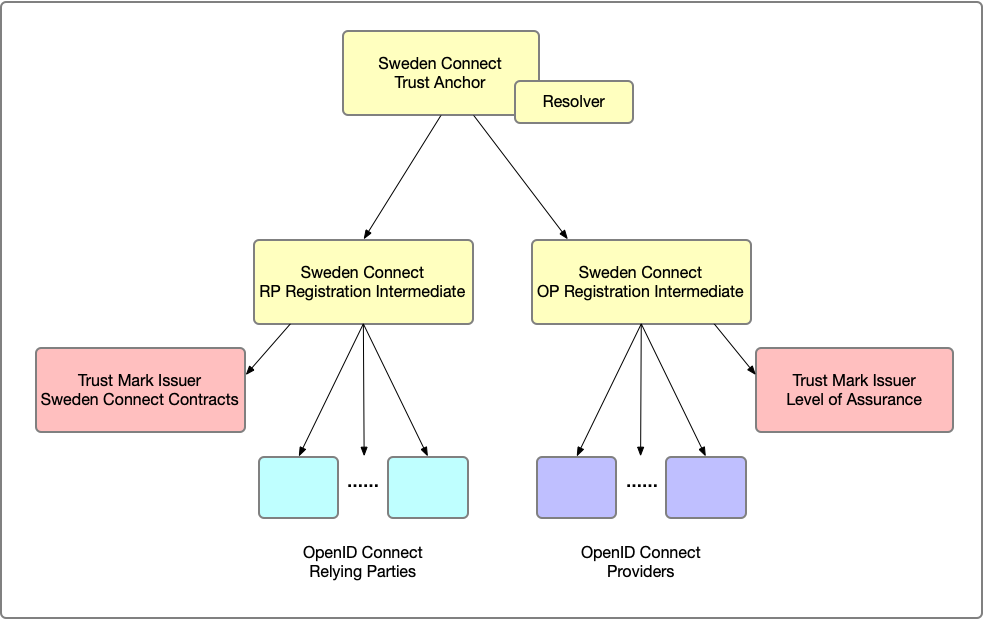 The Sweden Connect OpenID Federation structure can be visualized as shown below:¶