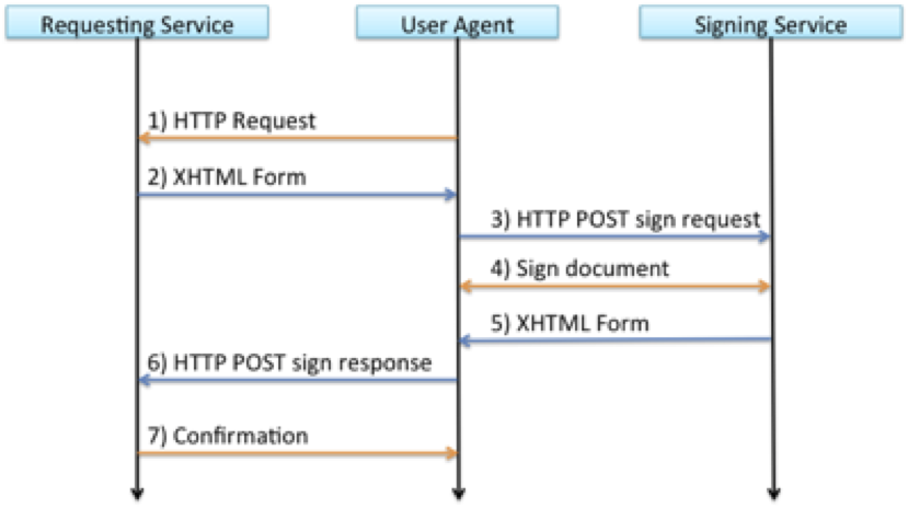 Sign request and response messages are exchanged between the Requesting Service and the Signing Service with the user acting as an intermediary through a user agent (typically a web browser) according to the following message flow: